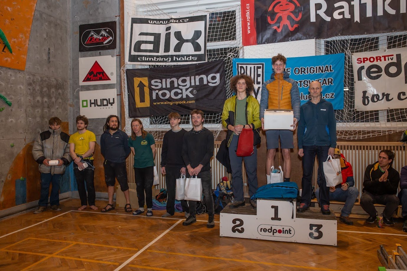 Po pauze vynucené přestavbou na finále mužů si zveme 10 mužských finalistů na představení a prohlídku. Tam to nebylo tak jasný jako u holek, protože 9 z nich mělo všechny topy a tím pádem to bylo vše otevřené. Cesta z dílny Prťky letos nebyla tak dlouhá jako jiné roky, s cílem aby se lezlo až k topu. Cestou byly tři klíčové sekvence kroků, které spolehlivě oddělovaly závodníky. Dlouholetý účastník našich závodů Hoza Zíma padá na konci druhé sekvence, a protože Pepa Gibson ještě pár kroků připsal, tak končí na třetím místě. Pepa bere druhé a pro první místo si do Police přijel Lukáš Uherec. Nejen že vyřešil všechny obtížná místa, ale měl i dost vytrvalosti dolézt cestu až na konec. Od pověstné třešničky na dortu chyběla jen cvalklá poslední preska. Zaslouženě vítězí a po dlouhé době jsme byli svědku vylezení finálové cesty. Stavěči byli spokojení a dle ohlasů i závodníci chválili cesty a organizaci.