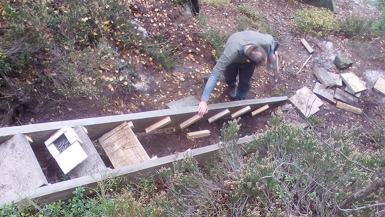 Jako první přišlyl na řadu schody k Hladomorně, které se totálně rozpadly a u Sluje chybějící schodnice. Poté jsme se s materiálem přesunuli ke Stěně starých pánů. Zde jsme jsme zpevnili svah pod nástupem do Pionýrského odznaku. U toho byl také vyměněn prostřední slaňák. Následoval přesun za Kočičák a výměna několika schodnic na tamních schodech.