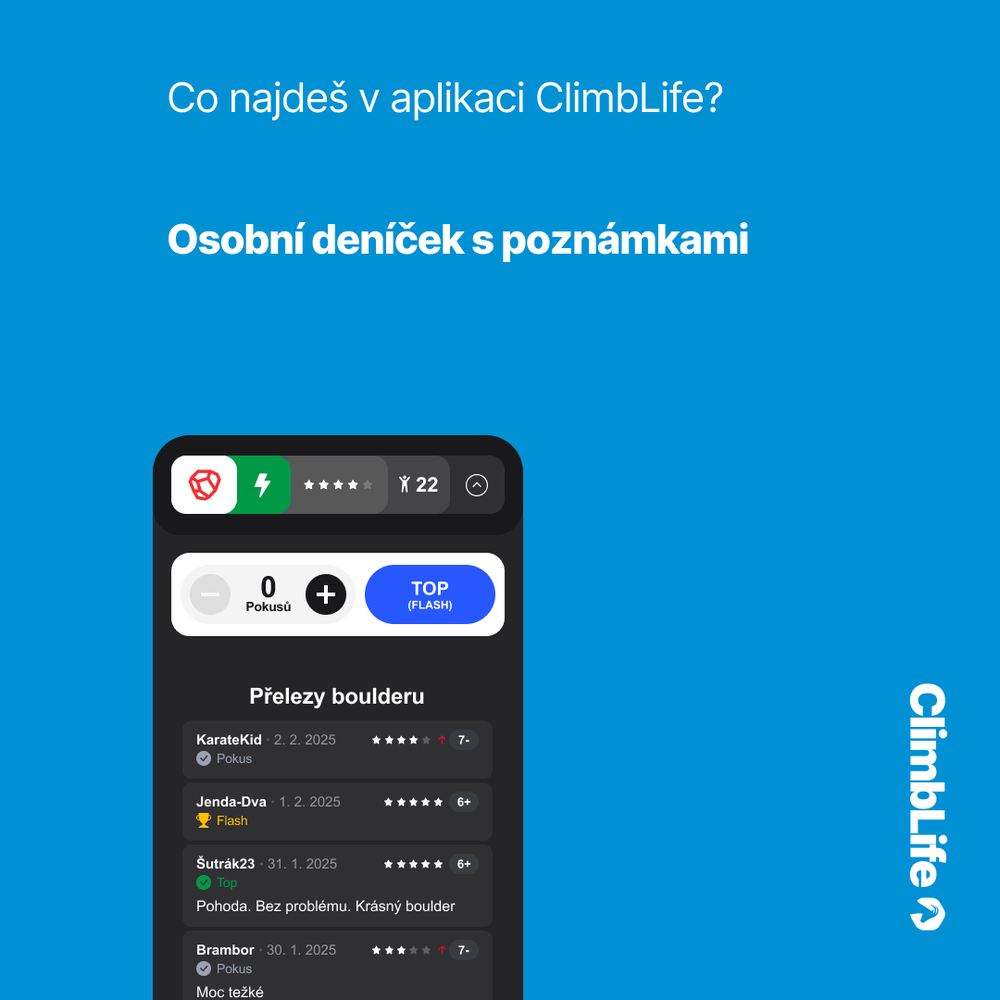 Stahuj, lez, zapisuj, hodnoť, sdílej pokrok, sleduj ostatní